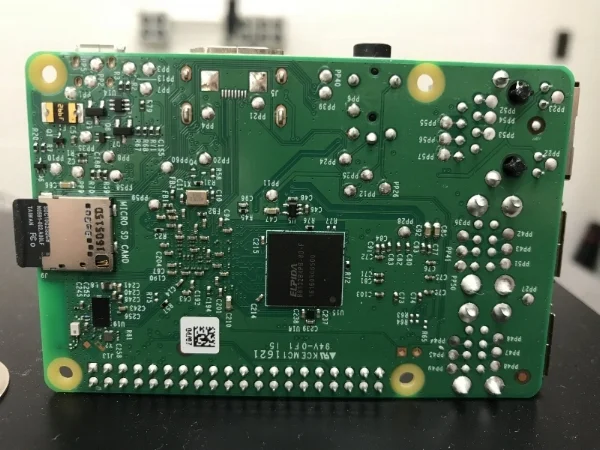 Raspberry Pi 3 on its side (viewing the bottom)